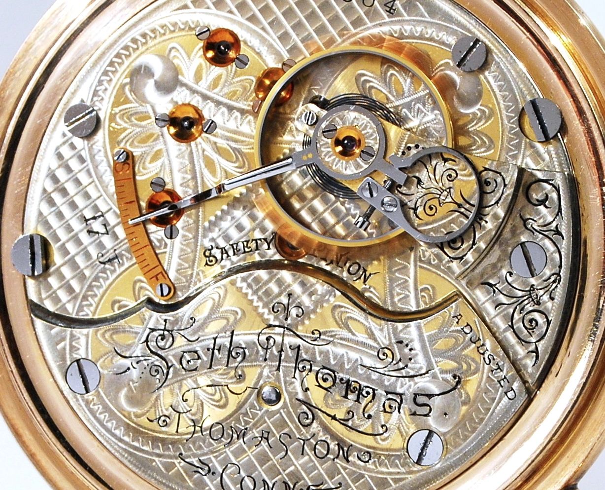 There are no known surviving Seth Thomas records regarding pocket watch production, other than a few factory catalogs and period ads. This is verified both by the Historical Society in Thomaston, Connecticut, thanks to a bad flood there in 1955, and seven-times-grandson Seth R Thomas, who supplied the genealogical records back to James and Martha, parents of the original Seth Thomas in 1785, and confirmed that no one in the family has any surviving factory papers.