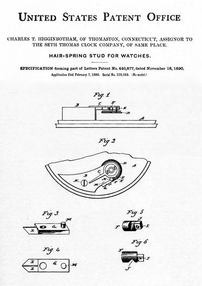 Charles Higginbotham, Seth Thomas's master watchmaker, invented a unique hairspring stud for the Henry Molineux grade, found on both Models 2 and 3.