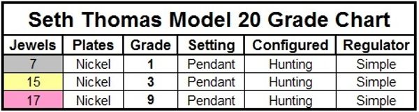 The Model 20 was made in a single run of some 4,600 movements with all examples between SN 2000001 and 2004800, first appearing in the 1908 catalog and continued in all of the known catalogs until the end of production in 1913, with prices of all the grades doubling by the end of their run.