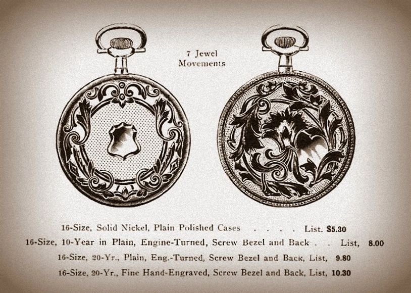 The Model 21 was the company's only known 16-size movement, and it came well after most of the other American firms had launched their own 16-size designs. It was part of the Centennial Series, introduced around 1913 to mark their 100-year anniversary, and offered in three jewel counts on a single nickel pinstripe pattern. All three of the Centennial sizes within the grade were retailed in either nickel or 10/20-year gold-filled factory cases.