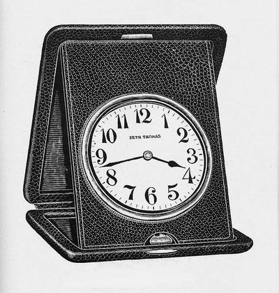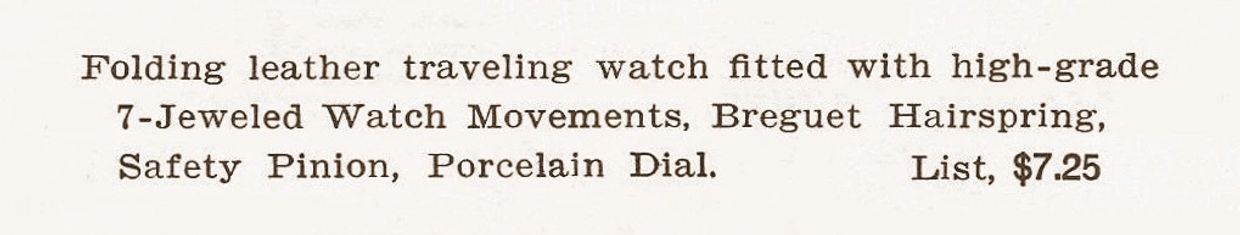 The Tourist was a newer, smaller version of the 18-size travel Companion in a folding design, containing a 7-jewel Model 21 with all of the standard features like a safety pinion and a Breguet (overcoil) hairspring on the balance wheel. It was offered in several different leather color choices, selling for $7.25 in the 1914 catalog. Note that the movement was upside-down, winding at the 6:00 position with no seconds bit on the porcelain dial.