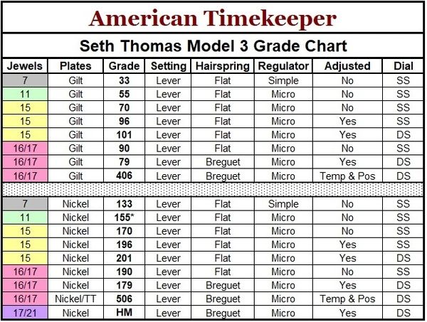 All known grades of the Model 3 have been determined from existing catalog excerpts and period advertisements. Several grades may appear redundant, since a couple of them could be "upgraded" by simply swapping the basic single-sunk dial for a double-sunk. Since it's not possible to know if a dial is original to a given movement, the lower grades have been used in all the search returns.