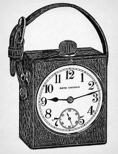 Seth Thomas offered a simple 7-jewel travel clock containing either a Model 6 with a flat hairspring or a Model 8 with a Breguet hairspring in a leather-wrapped metal case that was available in several color choices. The factory listed its top-grain leathers as lizard, alligator and seal with second-quality hides of pig and morocco in half a dozen colors.