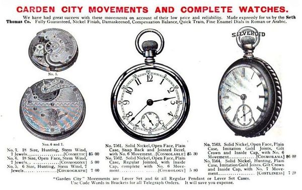 This Chicago wholesaler billed itself as The Busiest House in America on its catalog cover, selling only to retailers but not everyday citizens - the middleman scheme already firmly entrenched. They carried a short list of 6 and 18-size 7-jewel watches under the name of Garden City, made by Seth Thomas. Very few examples have been reported.