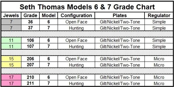 Grade assignments applied to both the Old and New Eagle models. Patterns were produced on gilt, nickel, or two-tone plates, and both of the Models 6 and 7 were lever-set. No separate grade assignment for gilt plates has been found, so these have been included along with the other finishes. No private labels or adjusted grades have been reported.