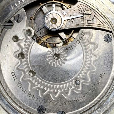 The only reported Old Eagle with seventeen jewels is full of contrasts, and may not be a regular production piece. For one thing, it's nickel, whereas all of the other jewel counts were available in two-tone, and the pattern is identical to a standard 7-jewel Grade 36. The plate jewel settings are larger than those of any other model, the balance cap jewel is press-fit and not screwed down, and there is no marked jewel count. The biggest tip-off may be the regulator, which is simple and there are no empty mounting holes for a gooseneck spring. The balance wheel does not have any meantime screws, and the hairspring is flat and not a Breguet, which was in use by then on the Model 5. The dial appears to be original and is a simple black-only pressed one, and all of the screws under the dial and between the plates are rough without polished heads.
