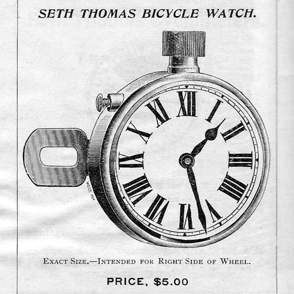 Seth Thomas carried a full line of cycling accessories, including cyclometers and a bicycle watch that contained a 7-jewel Model 7 hunting movement with a compensating (cut) balance wheel. It was stem wind and the hands were set by depressing the button near the mounting bracket. The firm claimed that the jarring incurred during normal cycling would have no effect on accuracy.