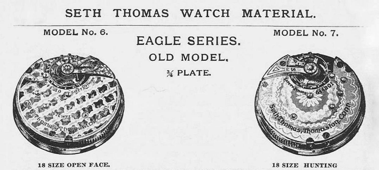 The Eagle Series again mimicked the Model 1 for plate layout, like the Model 3. The Model 6 was open-face and the Model 7 was hunter, and the two models were mirror images of each other, apparently designed as lower-cost replacements for the earlier Models 2 and 3. They made for an excellent daily carry watch, and with the 3/4-plate design they were sturdy and easy to service. Jewel counts ranged from 7 up to 17 on plates of gilt, nickel, or two-tone, and all were lever-set. They were too thick to fit into the new snug cases and named grades were common, such as Empire State and Montgomery Ward, along with the early eagle-inscribed variants, but no private labels have been reported.