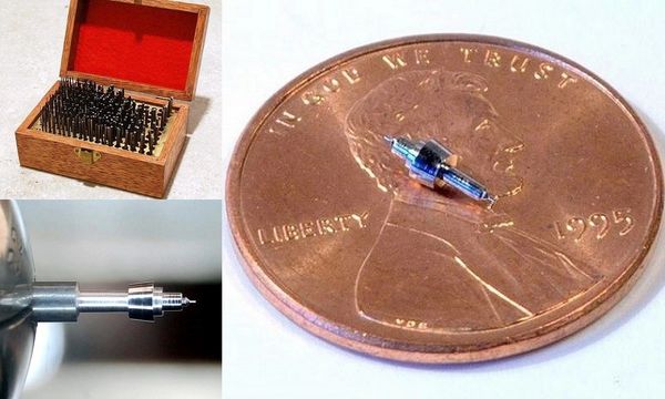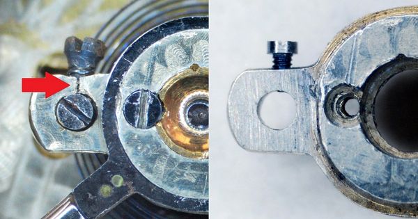 In this photo, some fool had forced in a ridiculously oversized screw, splitting the metal and then peening it as a band-aid fix. The nominal diameter of the correct screw was 0.4 millimeters, shown on the right.