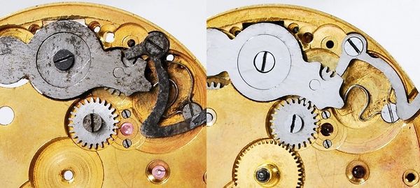The components under the dial are every bit as important as the ones between the plates, and yet they often go ignored. All of the hardware on your watch will be cleaned and inspected, milled flat and polished, and repaired or replaced as needed. This photo shows the work done on the yoke and setting lever of a rare Otay watch, made in California.
