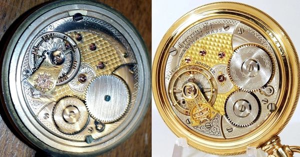Shown here is a 21-jewel Model 9 Illinois in the Santa Fe grade, a family heirloom that had lain in water for years in a leaky basement safe.