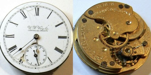 All three west-coast states are now represented, along with California and the state of Washington, with the first PL from Oregon having been reported. It's a dial for a UB Vogle from the city of Cornvallis on a 7-jewel gilt Grade 46 Model 14 with standard markings.