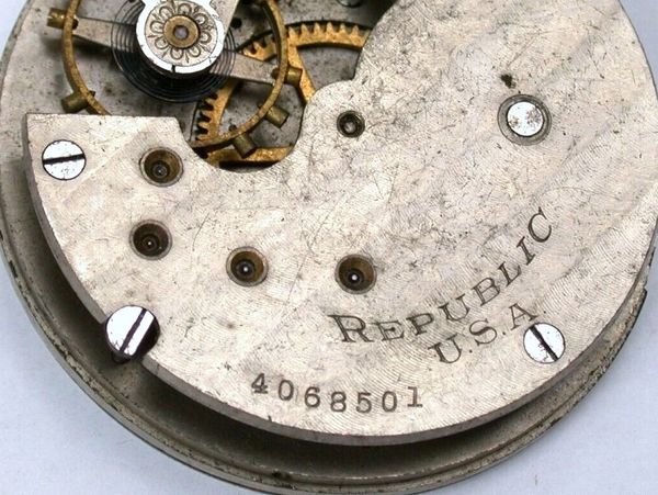 The previous highest-logged SN was 4016753, a 15-jewel nickel Model 18 in the Republic grade, which was thought to be the final output by the factory before 1915. Recently a 15-jewel Model 12 Republic has been reported with SN 4068501, some 50,000 numbers higher, and without a marked jewel count. This is puzzling, because the known Model 12 run peters out at just over SN 1300000, leaving plenty of room to continue its production before the hunting Model 13 began at SN 1700001. It's my feeling this was a mistake, with someone stamping a 4 instead of 1.