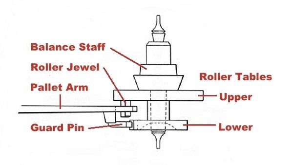 Overbanking occurs when the roller jewel becomes misaligned with the pallet, which was possible with the single roller design. The double roller was developed to address this, using a smaller lower table with an indent to mesh with a horizontal guard pin. This allowed the pallet arm to swing only when the roller jewel was in the cup, virtually eliminating overbanking. The only watches to be fitted with a double roller were the final runs of high-grade pieces.