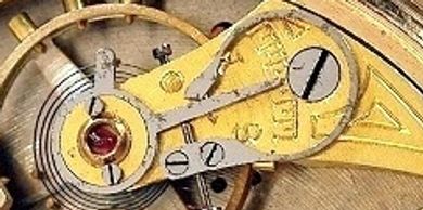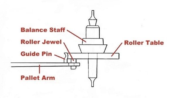 Any anchor or lever escapement requires a roller jewel, which is mounted in the roller table. On every cycle of the balance wheel this jewel gives an impulse to the pallet fork via the cup at the end of the pallet arm. A guide pin behind the cup prevented the pallet fork from drifting too early by meshing with a crescent-shaped cutout milled in the edge of the roller table. The overwhelming majority of Seth Thomas watches had single-roller escapements.